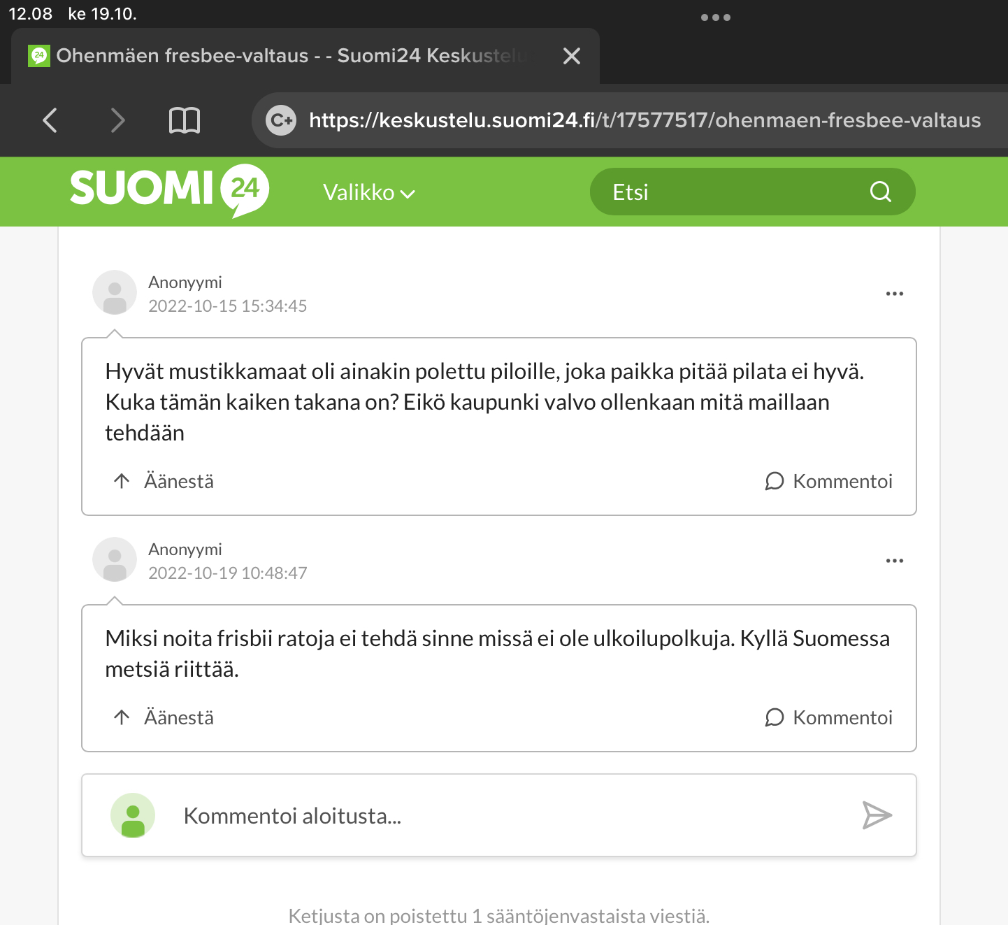 Kiitos palautteesta. Ohenmäessä on kattava polkuverkosto, jota monet lajiryhmät käyttävät. Toiminnalla on tarvittavat luvat.